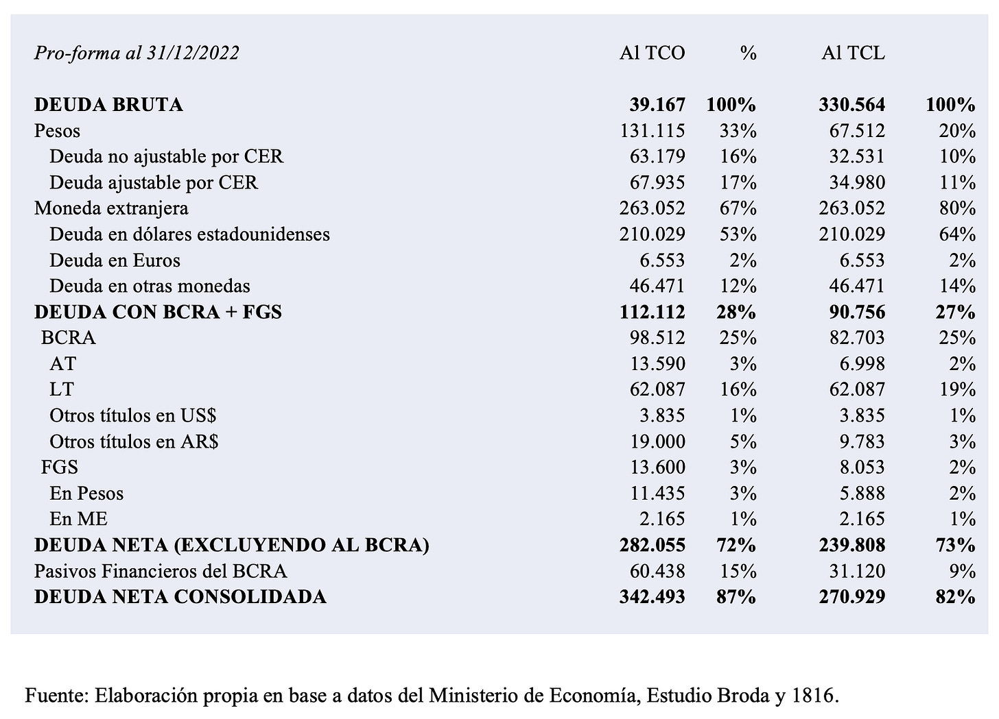 Pero esta cifra no representa la totalidad de la deuda consolidada del Estado Nacional, ya que no incluye lo que el BCRA le debe a los bancos, es decir, los pasivos remunerados o financieros (Leliq, Notaliq, pases, etc.). Al tipo de cambio oficial, esta deuda ascendía a US$60.438 al 31 de diciembre de 2022. Consecuentemente, la deuda neta sobre la cual el mercado estima la prima de riesgo argentino es de US$ 342.493 millones (al tipo de cambio libre es algo menor).