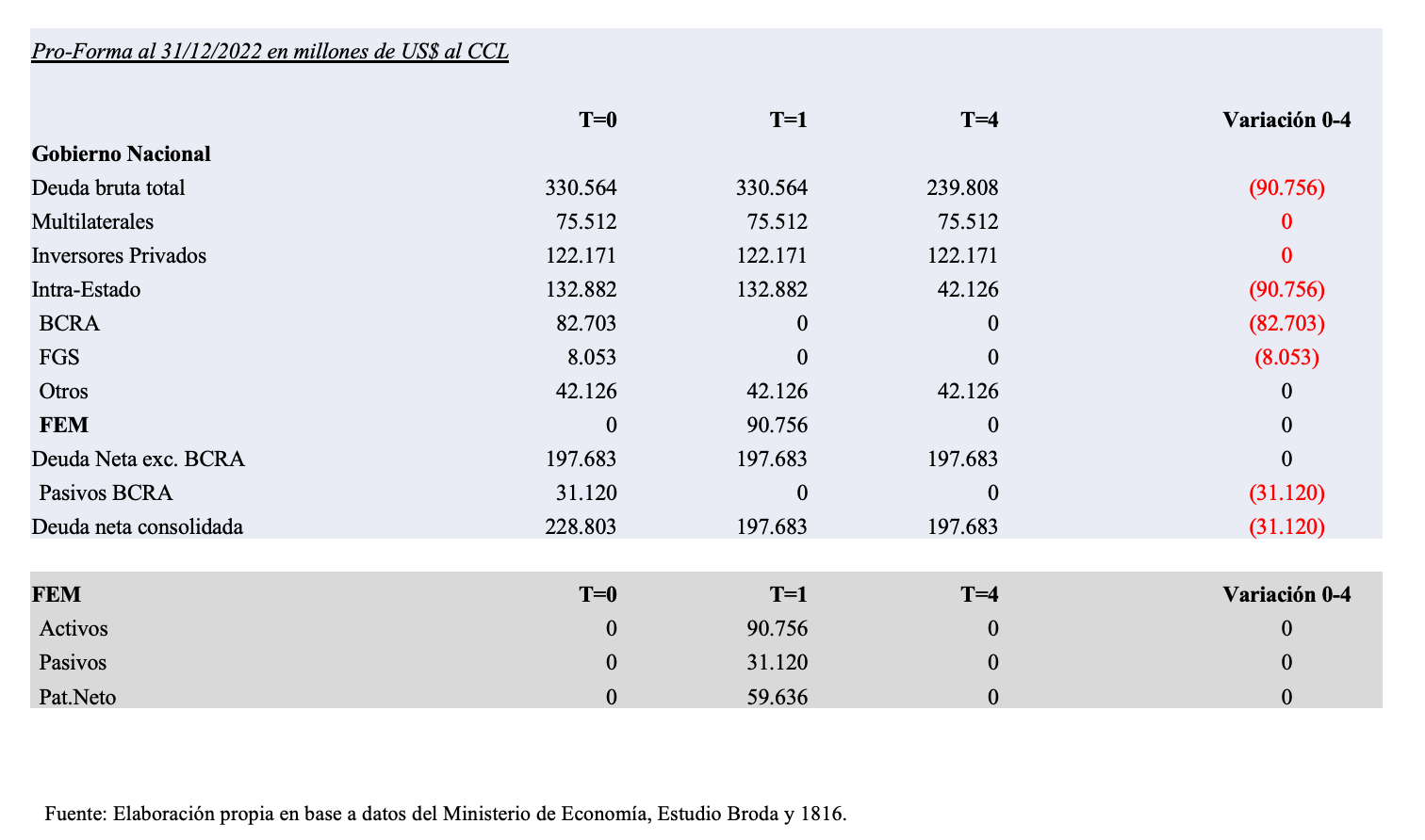 Es importante resaltar tres cosas. Primero, que el FEM es un vehículo non-recourse, es decir, que su deuda no sería exigible al Estado Nacional, sino que sólo tendría como respaldo los activos que mantiene en garantía. Segundo, el Estado Nacional (o el BCRA y el FGS) serían sus únicos beneficiarios. Tercero, la deuda pública neta consolidada permanecería inalterada. No hay endeudamiento neto adicional.